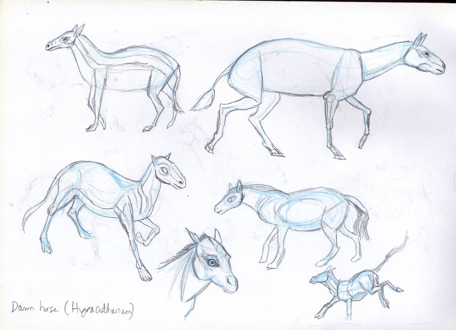 Below are many of my horse sketches, plus studies from Terry Whitlatch's book. I studied a wide range of horses including prehistoric horses. These sketches are all taken from photo references on Google and from "The Science of Creature Design."
